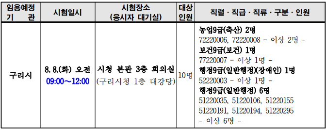면접 장소는 구리시청 본관 1층 대강당에서 2023. 8. 8.(화) 09:00 ~ 12:00에 진행되며 면접은 개별 역량면접으로 진행이 되오니 응시생분들은 응시표, 신분증, 필기구, 수정테이프를 준비하셔서 면접 진행을 하시면됩니다. 또한, 추가 면접시험에 참석하지 않으면 불합격 처리되며, 시간 미엄수로 인한불이익은 응시자 본인의 책임으로 합니다.